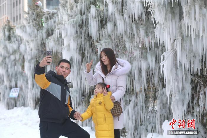 图为市平易近正在冰挂前留影。中新社记者 弛忠苹 摄