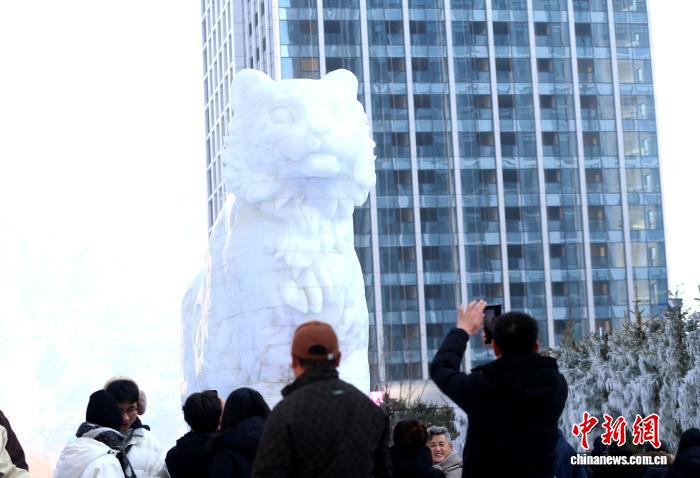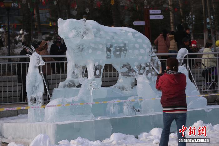 图为年夜型冰雕雪豹吸收市平易近挨卡。中新社记者 弛忠苹 摄