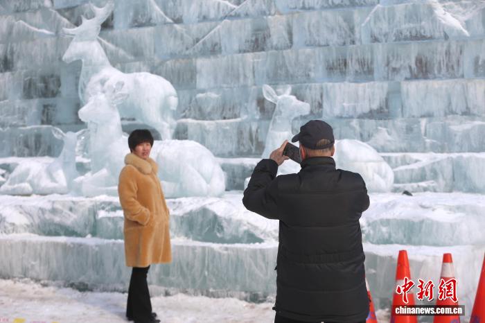 图为市平易近正在冰雕前挨卡。中新社记者 弛忠苹 摄